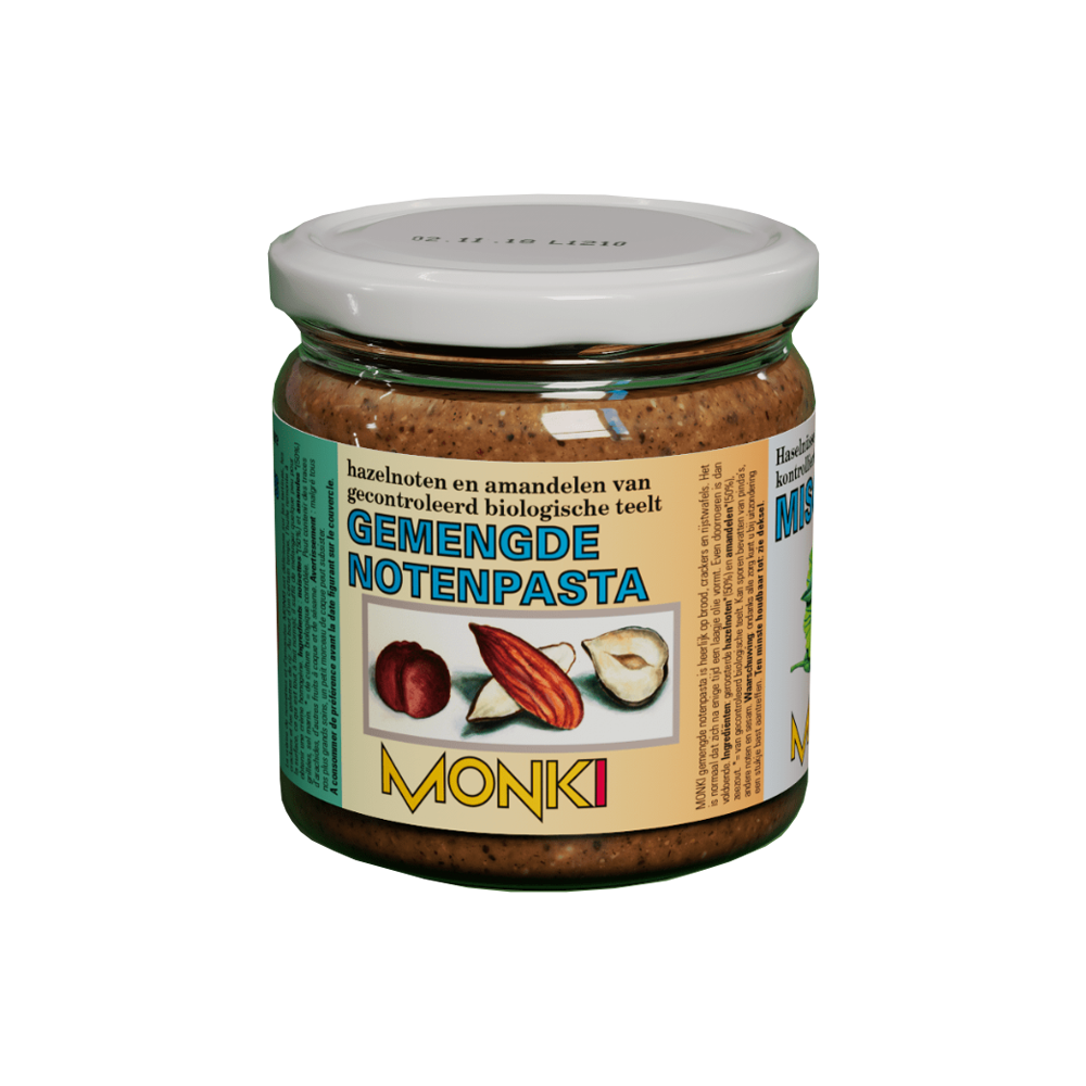 Monkis ekologiska nötpastor har många möjligheter - bre på smörgåsen, som dipp, pigga upp din smoothie eller dressing. Passar även utmärkt att baka med. Rostade eller orostade nötter och frön mixas till en smakrik och fyllig pasta som en del smaksätts med en gnutta havssalt, inget annat tillsatt. De innehåller hälsosamma fetter ochprotein från växtriket. Ingredienser: Rostade HASSELNÖTTER*(50%) och MANDLAR*(50%), havssalt*. *=från kontrollerade ekologiska odlingar. Näringsvärde per 100 g: Energi..........3016 kJ/730 kcal Fett..........66 g varav mättat..........5 g Kolhydrater..........11 g varav sockerarter..........5 g Protein..........19 g Fibrer..........8 g Salt..........0,31 g NL-BIO-01 EU/Icke EU-jordbruk