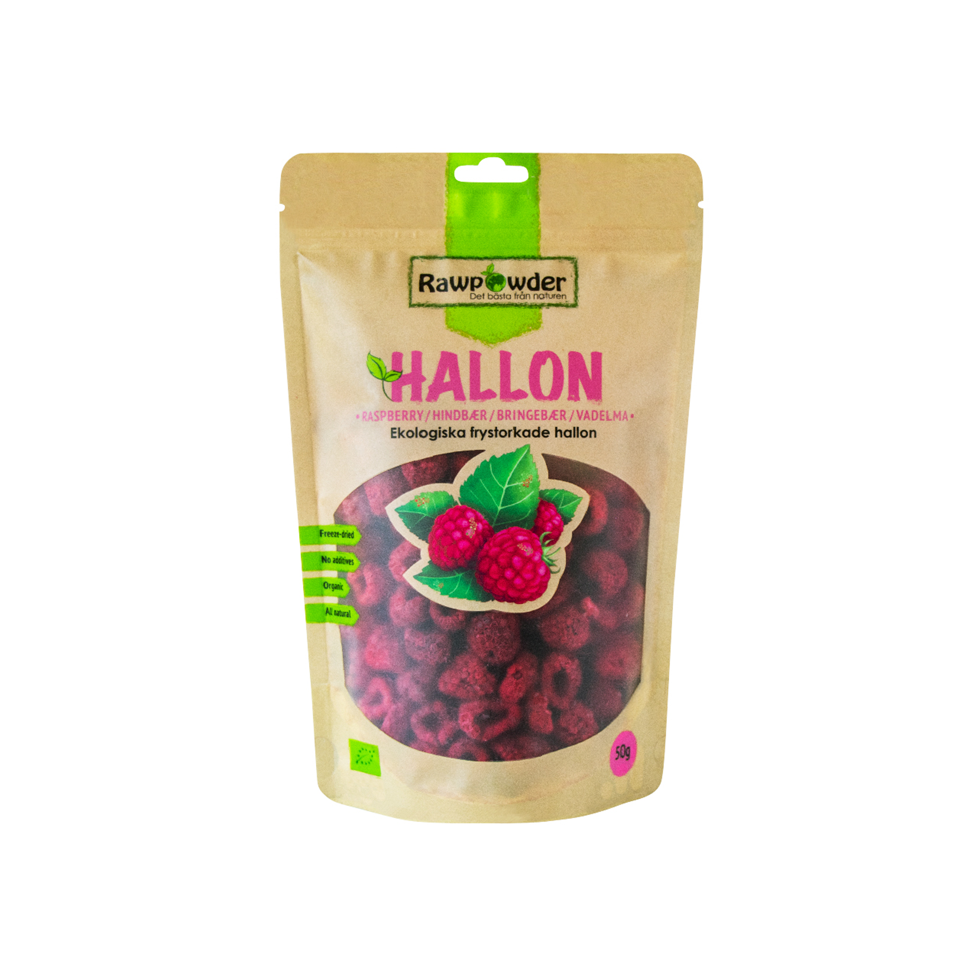 Frystorkad Hallon med en rik och intensiv smak där man har kunnat bevara dom flesta av näringsämnen och dom viktiga antioxidanterna genom frystorkningsprocessen.