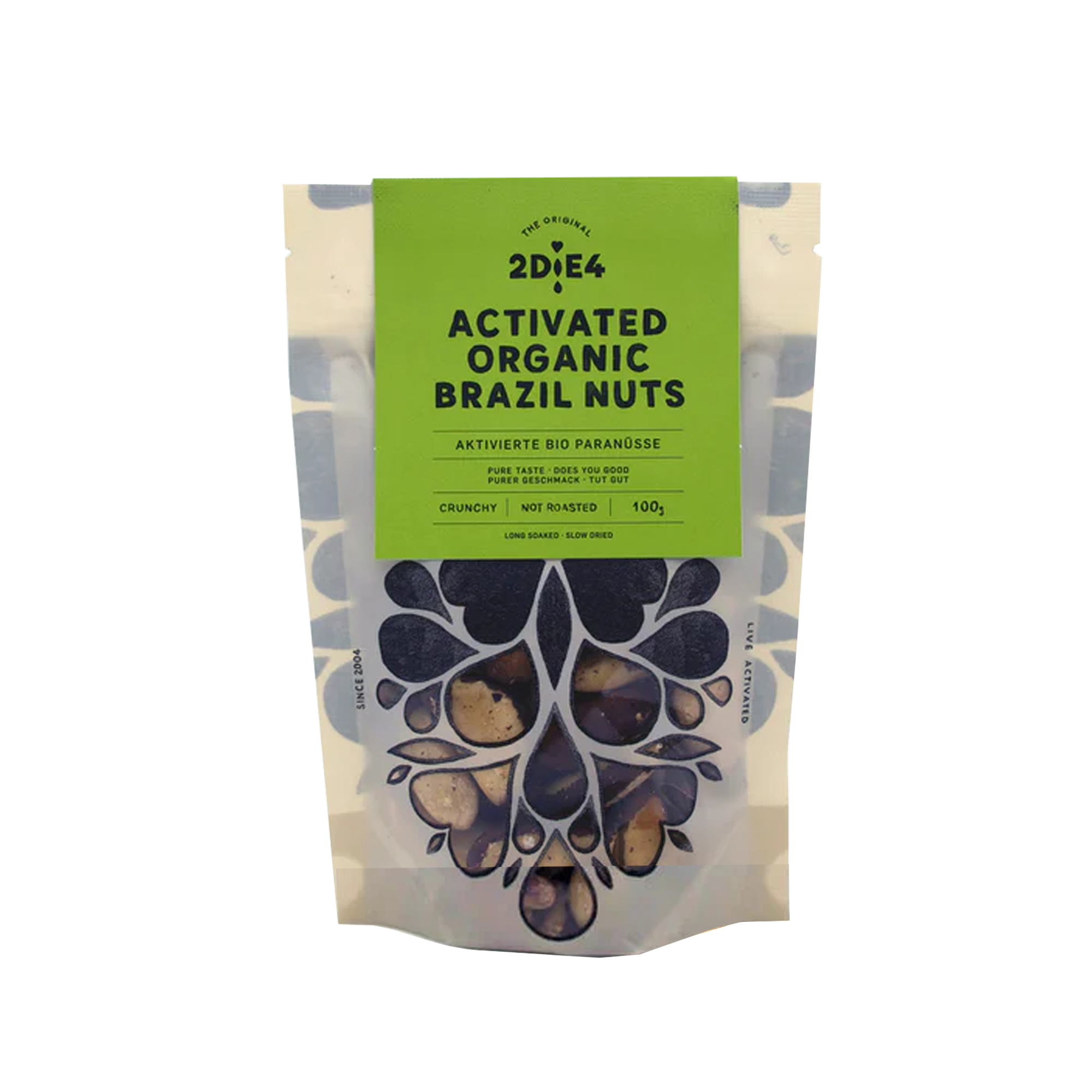 Aktiverade paranötter från 2die4 smakar mer, är mer näringsrika och har överhuvudtaget ingen bitterhet. Nötterna blir blötlagda i en lag som består av vatten och keltiskt havssalt. Genom blötläggningen kommer en fermenterings- och groddningsprocess igång som aktiverar nötterna. Efter detta genomgår nötterna en skonsam torkningsprocess. Vid låga temperaturer försvinner återigen vattnet, som kom in i nötterna under blötläggningen tidigare. De värdefulla näringsämnen som nu har uppstått bibehålls därmed och blir återigen aktiverade när nötterna stoppas in i munnen och kommer i kontakt med vårt saliv. Ingredienser: Paranötter*, havssalt, källvatten. * Ekologiskt certifierad Näringsvärde per 100 g: Energi..........2886 kJ/ 689,3 kcal Fett..........68,5 g varav mättat..........14,8 g Kolhydrater..........12 g varav sockerarter..........2,4 g Protein..........14,4 g Salt..........0,4 g DE-ÖKO-003 EU/Icke EU-jordbruk