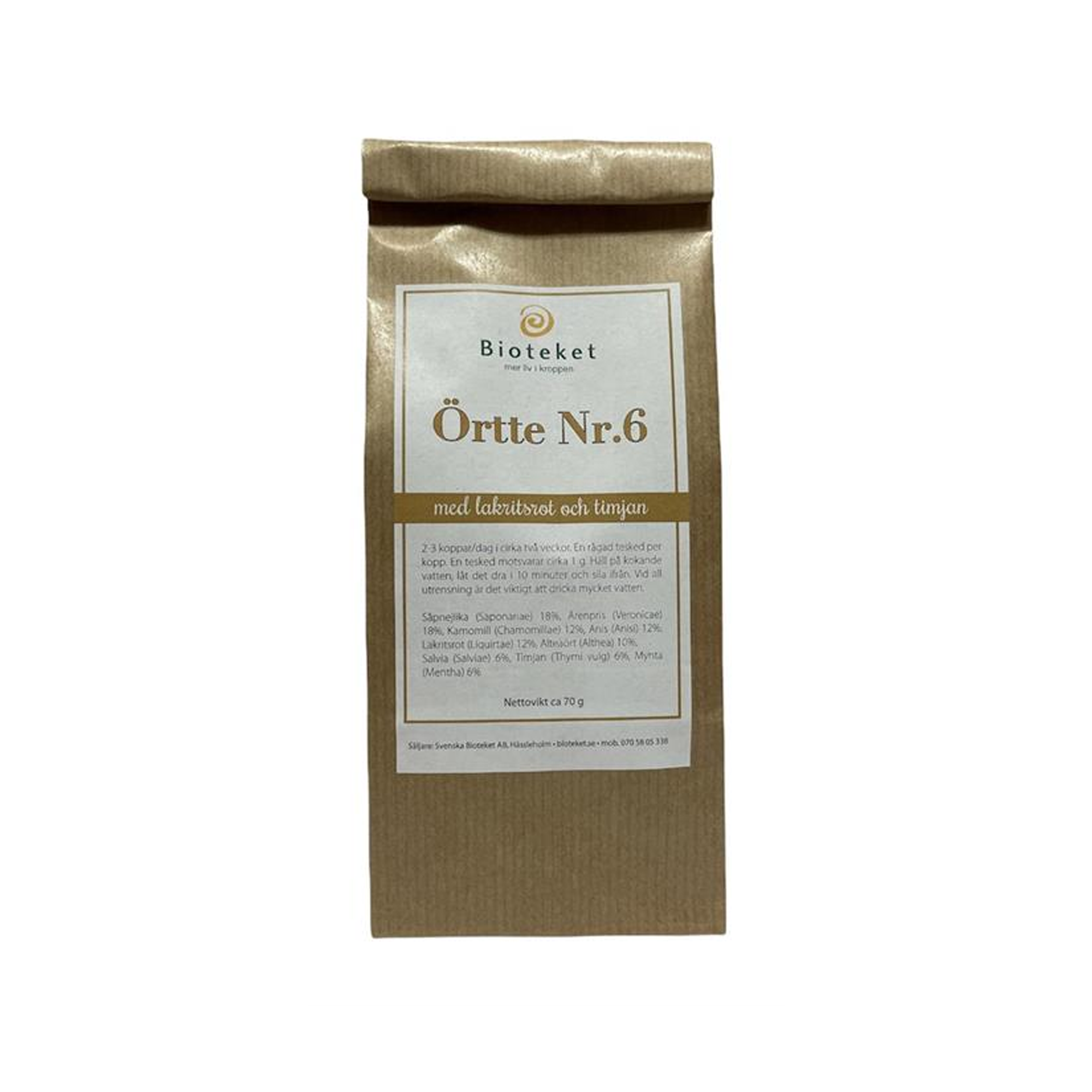 Innehåll: isop (hyssopus officinalis) 20%, Kamomill (Chamomillae) 15%, Anis (Anisi) 15%, Lakritsrot (Liquirtae) 15%, Alteaört (Althea) 15%, Timjan (Thymi vulg) 10%, Mynta (Mentha) 10%