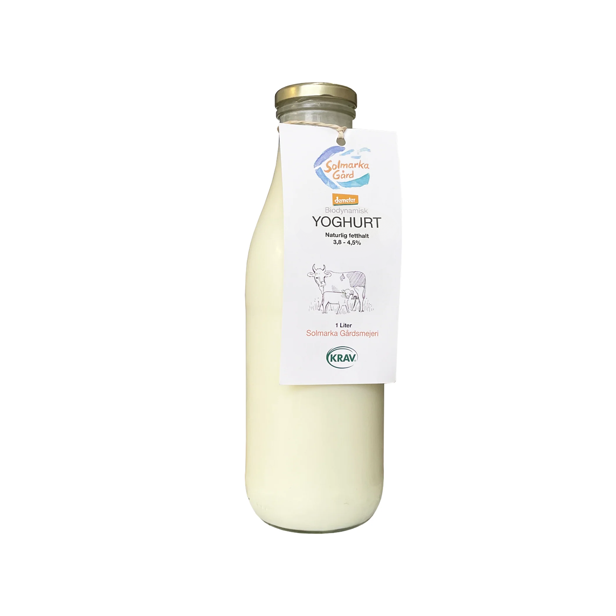 Biodynamisk naturell yoghurt från Solmarka gård. Naturlig fetthalt 3,8-4,5%.